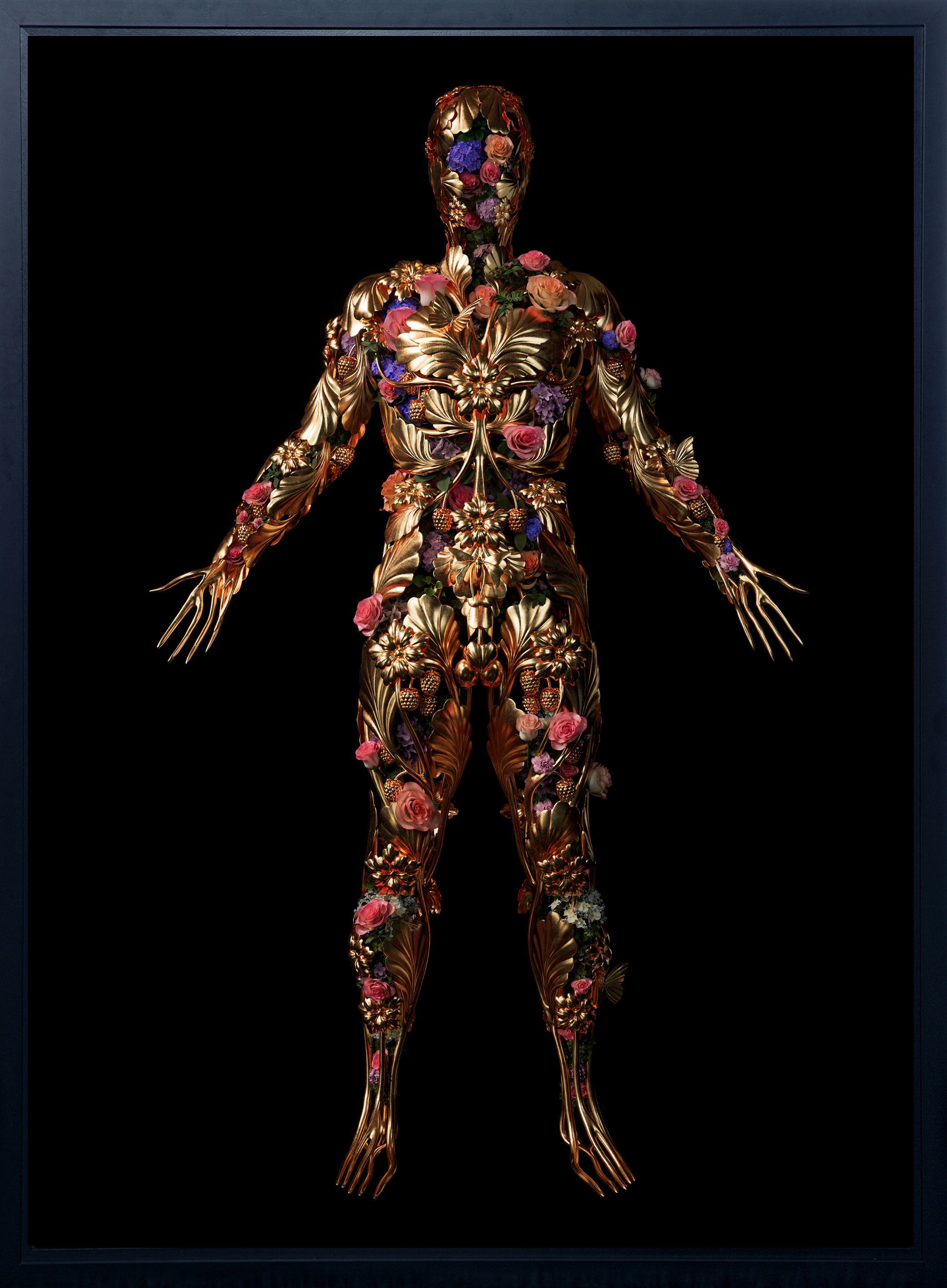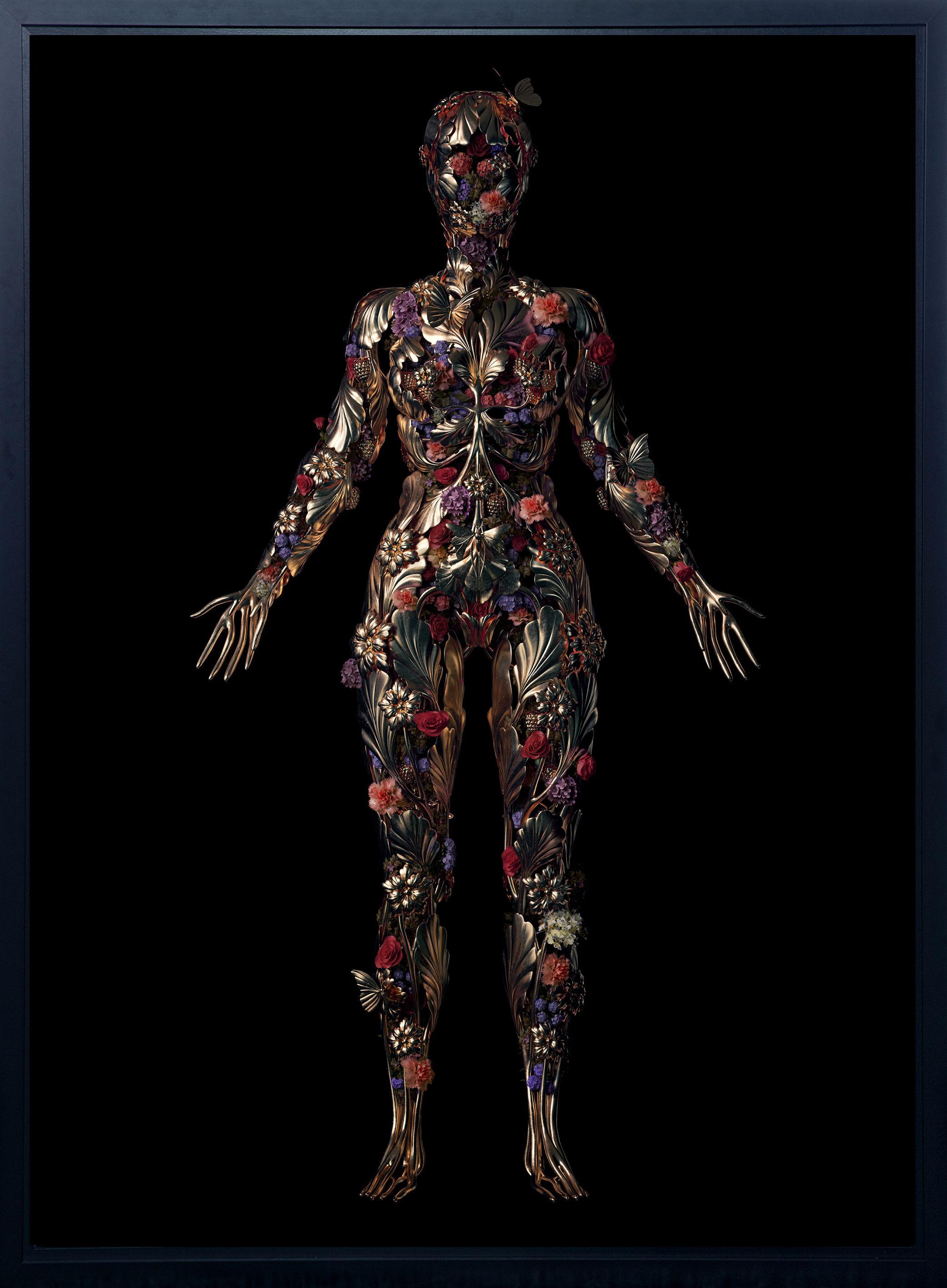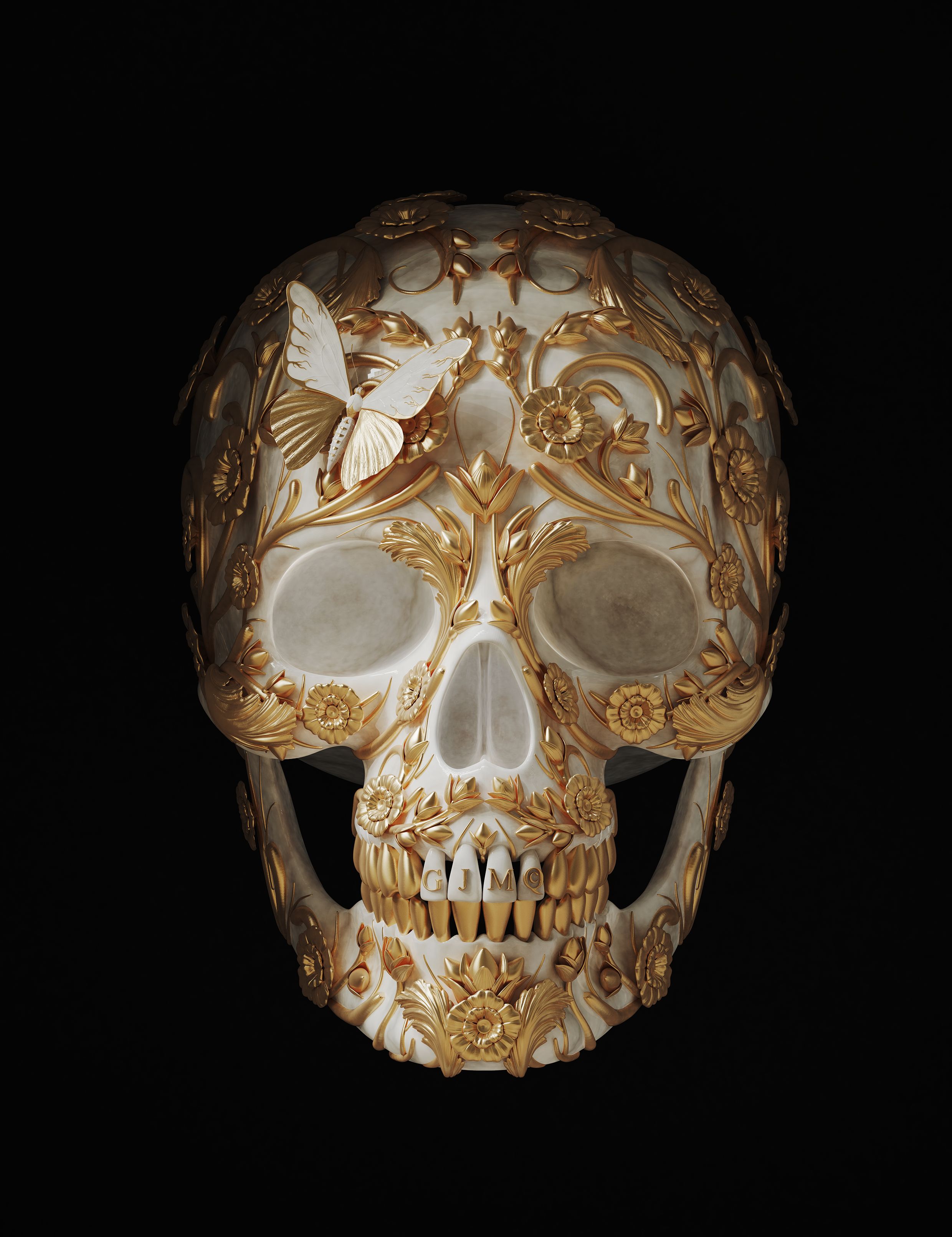 Drawing inspiration from the legend of King Midas, these digitally sculpted skulls are adorned with golden flora set on a foundation of marble. They are a prelude to a new signature style - Form & Flora.