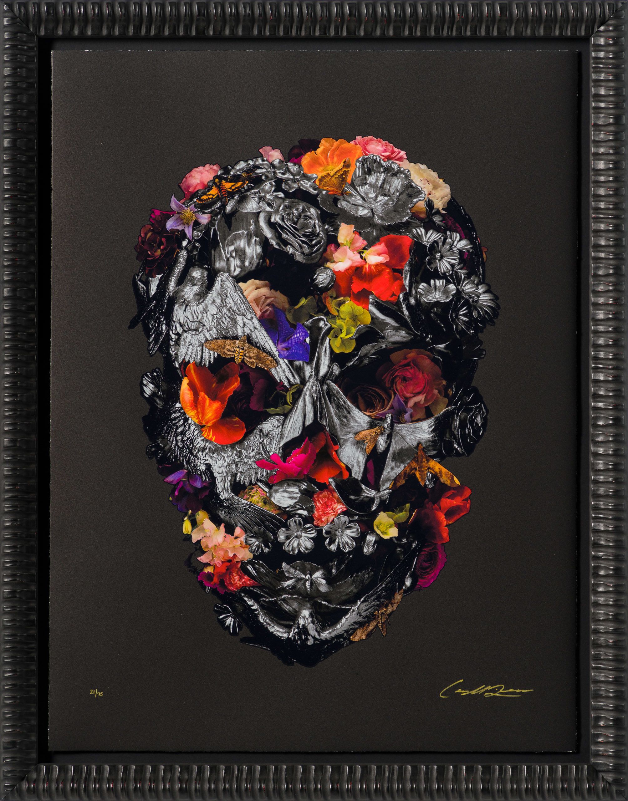 It comprises a physical golden skull sculpture which was hand drawn and then digitally sculpted. The delicate flowers, birds and moths embedded in the skull work in unison to form an intricate and exotic experience. The flowers in full bloom inside the skull’s framework set a tone that is melancholic and romantic illuminating beauty in the mystical and macabre.